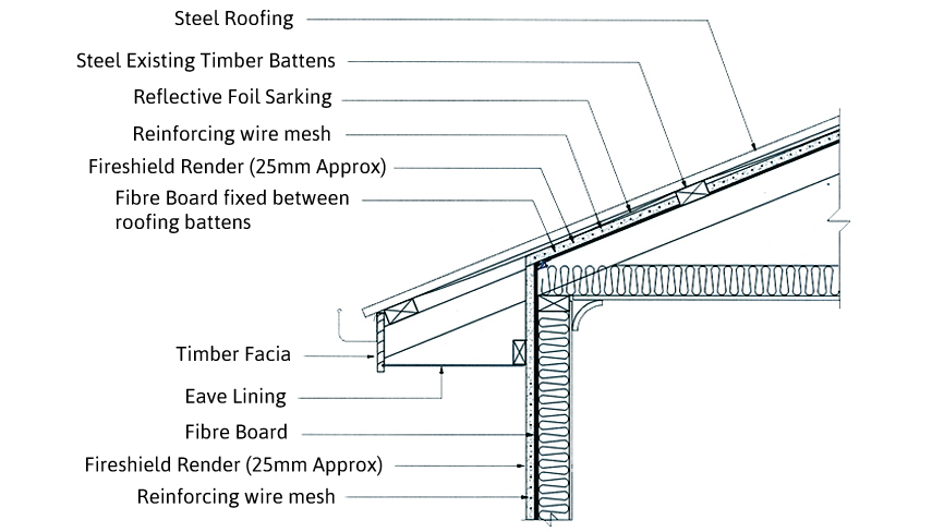 The system also makes the wall and roof structure stronger as the fibre board and reinforced masonry are fastened to the wall studs and roof rafters. This also helps stop flying debris impacting during a fire storm. If roof iron is moved or dislodged, the reinforced masonry is there for added security.